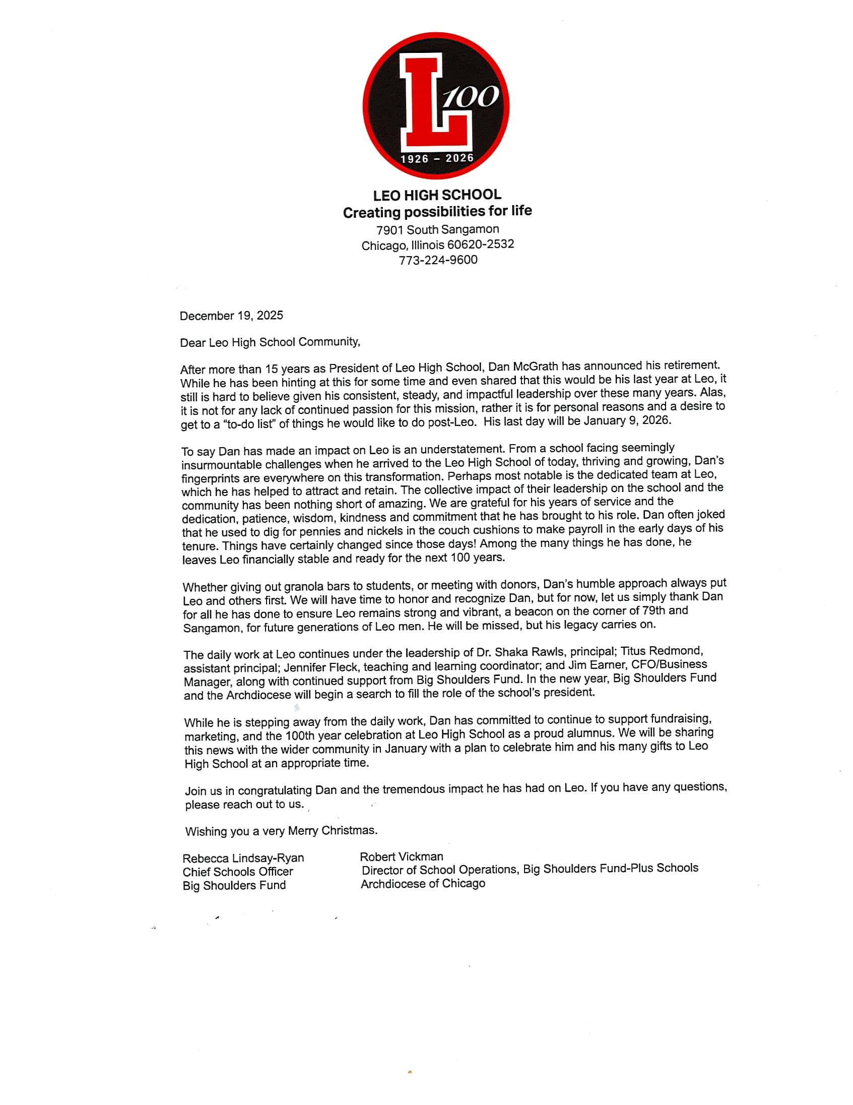Turning a Page – Dan McGrath announces his retirement as President of Leo High School